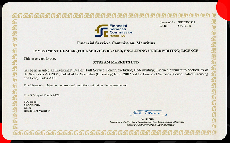 Xtreme Markets is regulated by the Financial Services Commission of Mauritius. It is under offshore regulation, holding a Retail Forex License with the license number GB22200951.